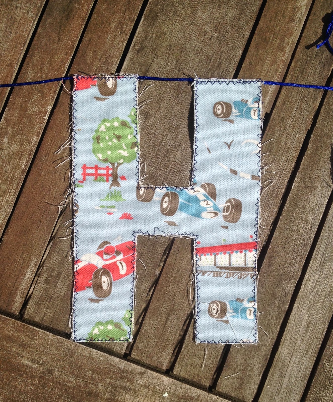 Late on the eve of Middle B's first birthday I decided to make a 'quick' bunting spelling HAPPY BIRTHDAY. Quick it was not.... HOURS later and without a pair of pinking shears or adequate time I produced this: